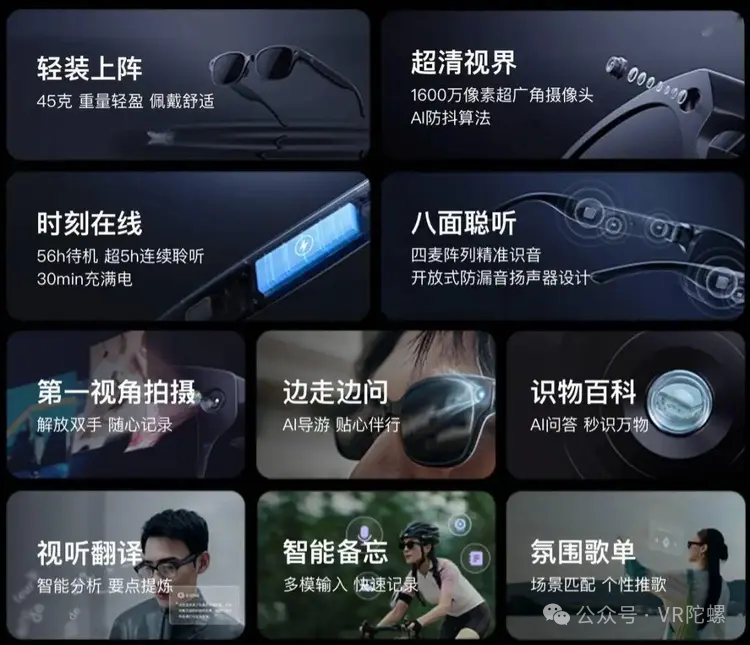 续航能力上,设备通过低功耗架构优化,据称待机时长可达 56 小时,连续音乐播放时长超 5 小时,支持 30 分钟快速充电;机身重量为 45 克,采用与普通光学眼镜相近的造型设计,提供多种款式选择,重心分布经过优化以适配长时间佩戴。
