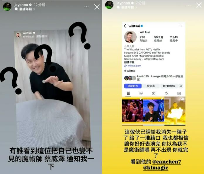 10月16日,据《镜周刊》、《ETtoday星光云》等台媒报道,15日,周杰伦突然在社交平台上连发两文寻人,其贴出蔡威泽社交账号,并配文“有谁看到这位把自己也变不见的魔术师,蔡威泽,通知我一下”。