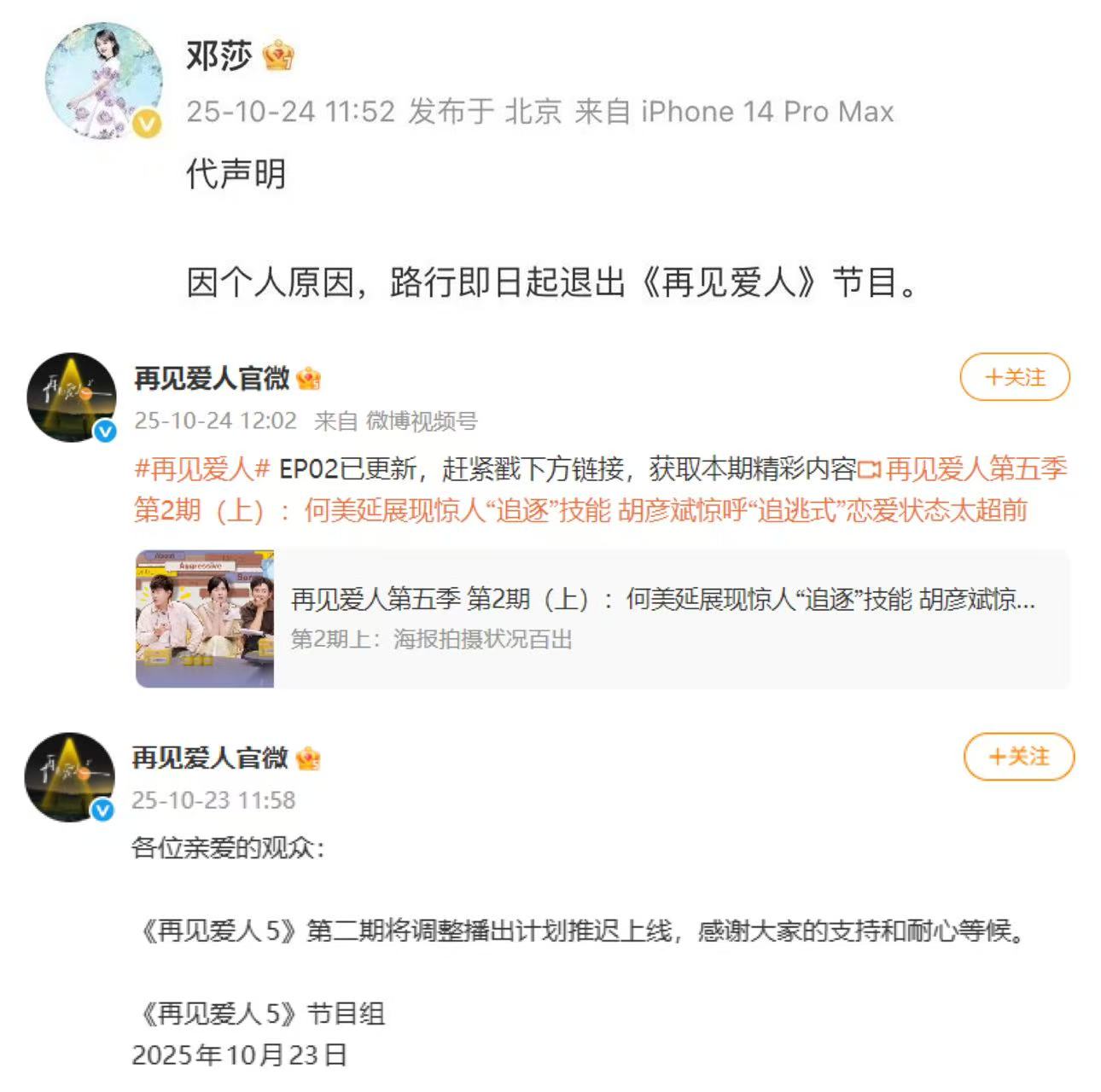10月24日,演员邓莎在其微博上发布:代声明,因个人原因,路行即日起退出《再见爱人》节目。
