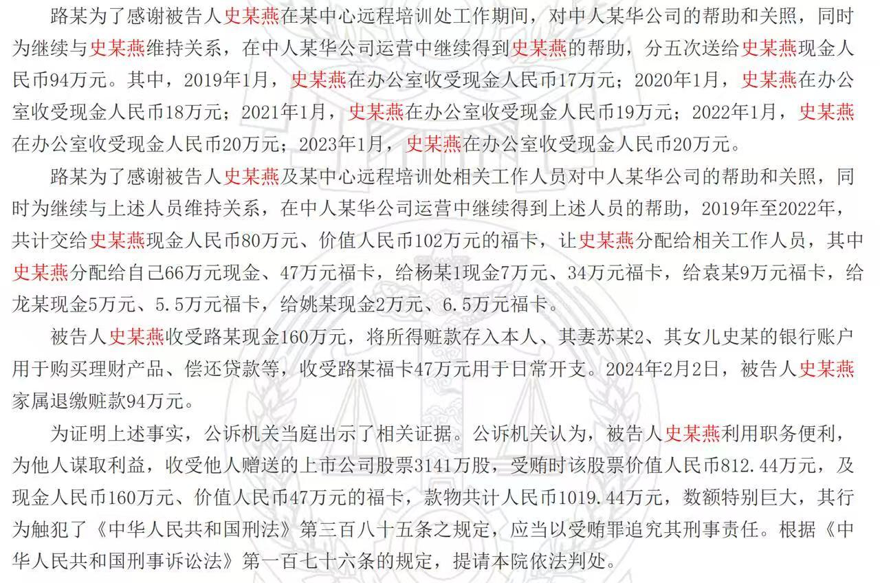 根据《史某燕受贿一审刑事判决书》【(2024)陕1002刑初153号】,商洛市商州区人民检察院指控,被告人史某燕利用担任某中心远程培训处副处长、处长及中人某华公司高管等职务上的便利,在中人某华公司经营过程中为路某提供关照和帮助,非法收受路某所送的价值812.44万元某联控股股票3141万股、现金人民币160万元、价值人民币47万元的福卡。法院一审以史某燕犯受贿罪判处其有期徒刑10年6个月,并处罚金人民币100万元;违法所得207万元中,已退缴94万元,剩余部分继续追缴。