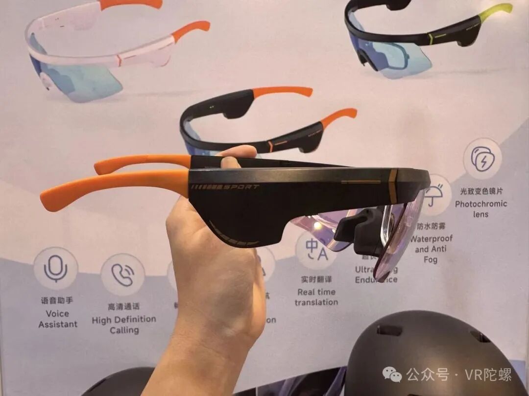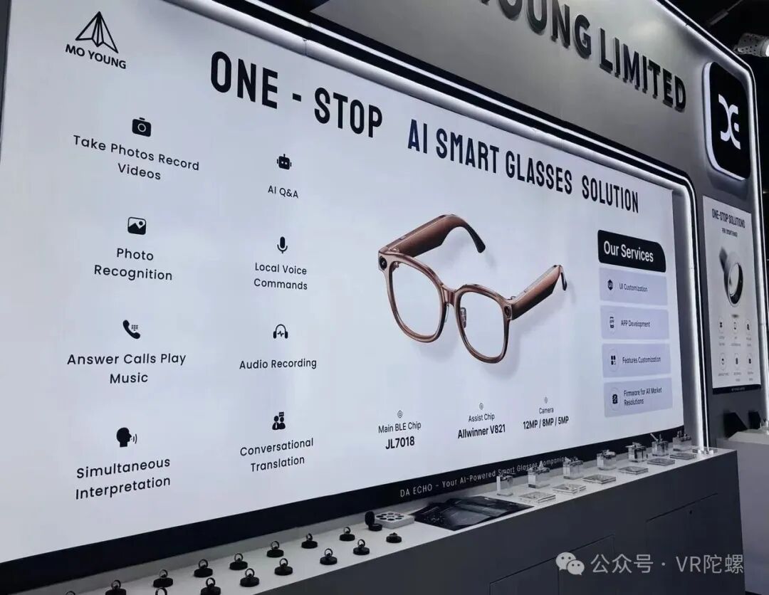 VR陀螺在现场观察到,超过 30 家 AI 眼镜展商中,绝大多数都拥有一个共同的背景:他们是 TWS 耳机、智能手表或蓝牙音箱等成熟消费电子领域的老玩家。从 Caeton Tech、南北智造(中山)科技发展公司、东莞市亿华人数码科技有限公司、深圳市三汇实业有限公司、GloryFit,到哈力友有限公司、深圳市柴高电子科技有限公司、东莞市斯凯登科技有限公司等数十家公司皆展示了 AI 眼镜。