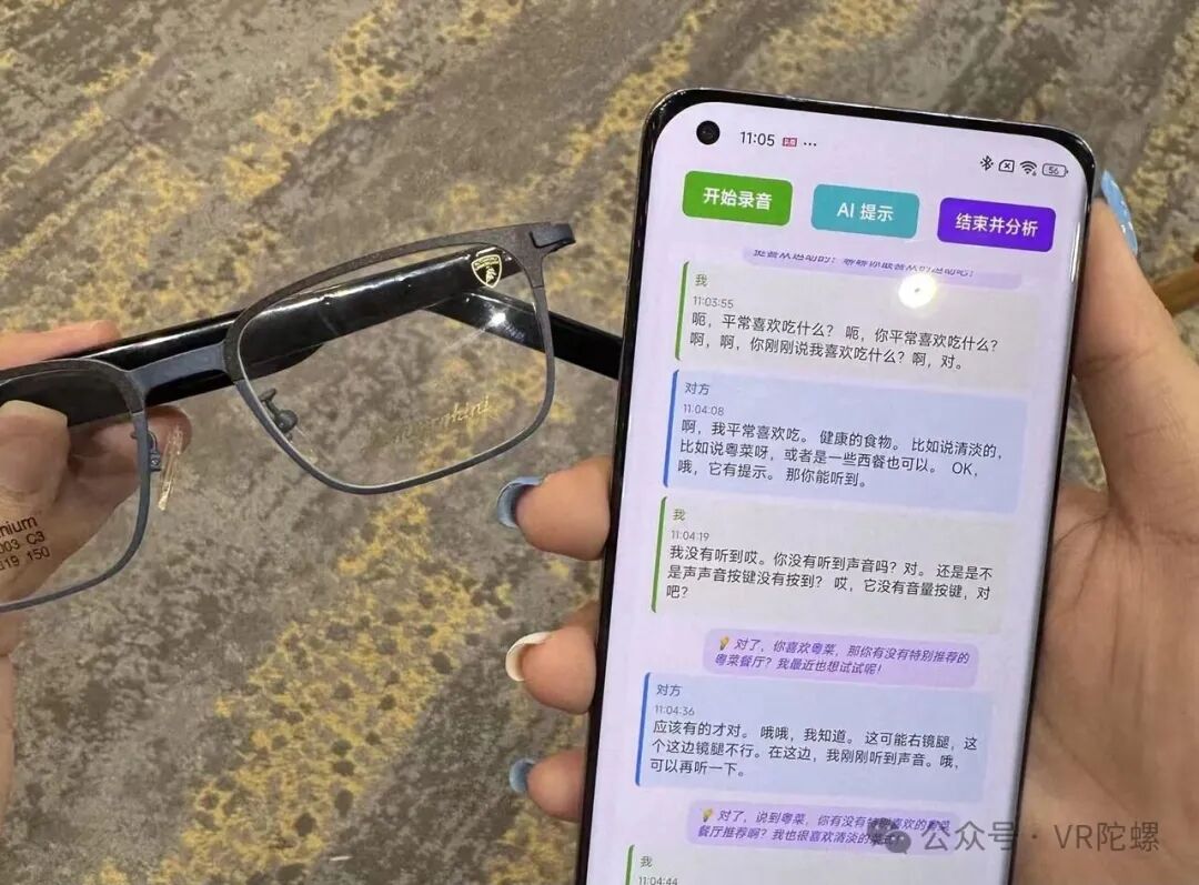 垂直场景探索:拂曦科技展示了一款专注于约会场景的 AI 眼镜,其核心功能是为社交障碍用户提供实时的语音提示和话题建议,辅助线下交流。
