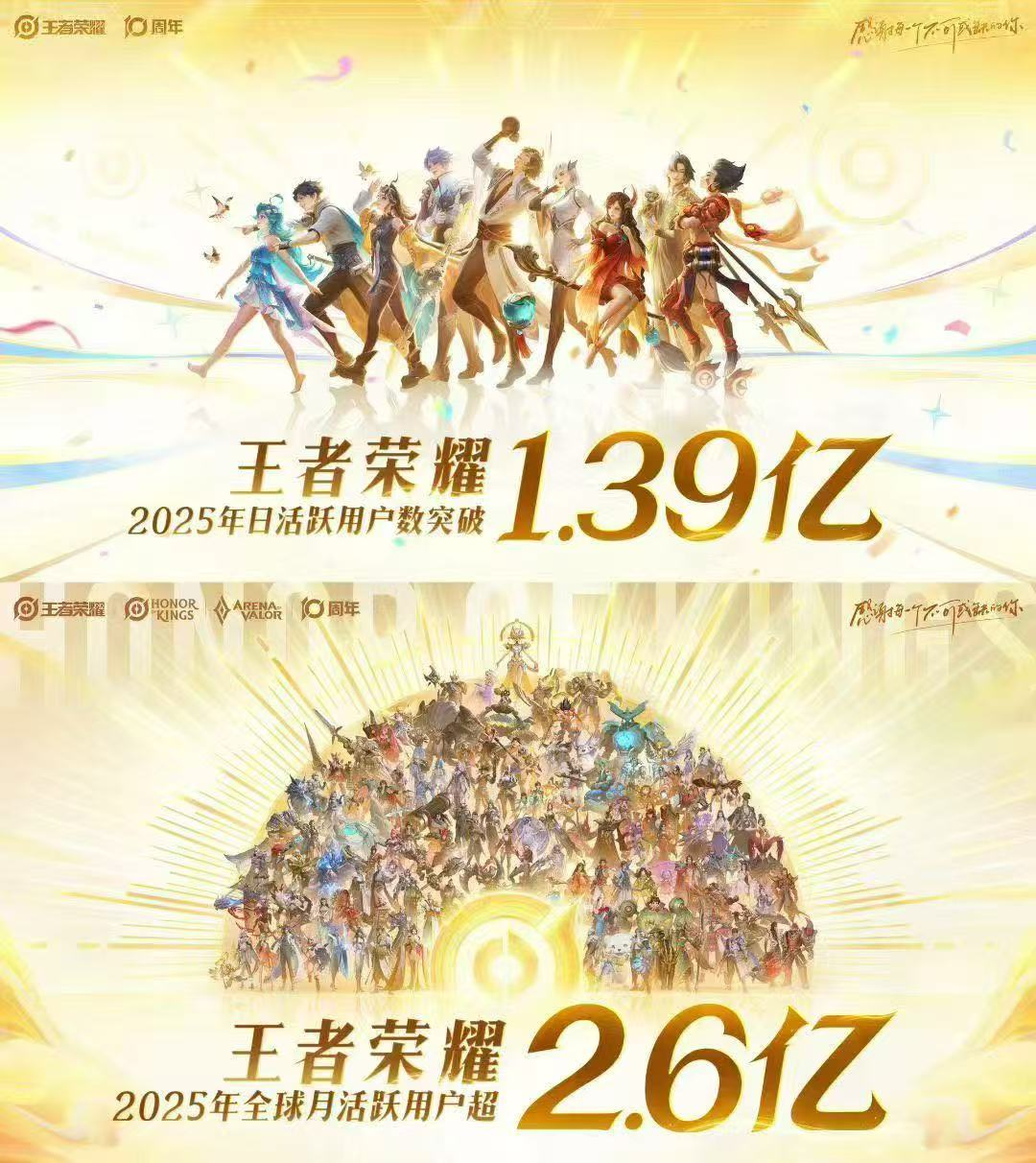 【7】10月26日,王者荣耀2025共创之夜在成都·五粮液文化体育中心-综合体育馆举行。官方在活动上宣布,《王者荣耀》日活跃用户突破1.39亿,月活跃用户超过2.6亿。
