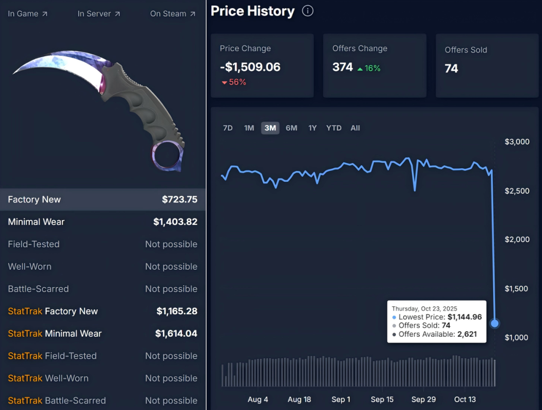 此举直接引发二级市场动荡——据统计,仅数日内游戏饰品总市值便蒸发约15-42%,估计损失高达10亿美元以上。