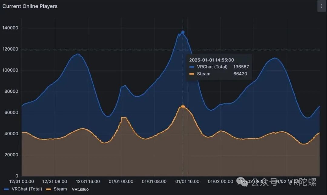 根据第三方数据统计,2025年1月1日当天VRChat的同时在线人数突破13万,相比2024年同期增长约30%。随着手机端的上线,相信用户数量还会进一步增长。
