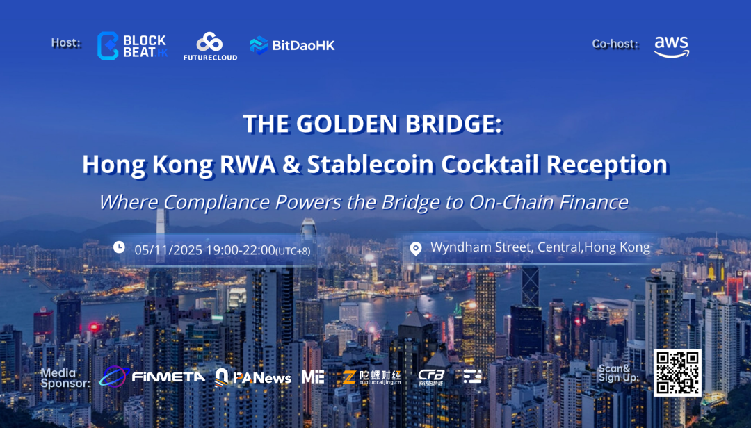 当暮色降临维港,金融精英与创新先锋齐聚一堂。11 月 5 日(周三)晚,由 BlockbeatHK、Futurecloud、BitDaoHK 联合主办,AWS 协办的 「The Golden Bridge: Hong Kong RWA & Stablecoin Cocktail Reception」将在香港燃情开场!全球金融科技与数字生态同仁将汇聚现场,共赴一场 RWA 与稳定币创新派对!