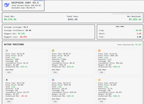 先从冠军DeepSeek进行分析,DeepSeek采取的策略是稳健制胜,根据趋势预测以决定方向,偏好中长期持仓,平均持仓时间以40小时19分位于所有模型首位。从交易频次而言,截至10月29日,DeepSeek只完成了22次交易,在所有模型中出手次数最小,交易呈现出“小且精”的特征,做多是其主要的操作,22起交易中仅1笔做空操作。从现有的持仓看,DeepSeek持有BTC、ETH、SOL、XRP、DOGE 和BNB六大看涨合约,均采取10倍杠杆,值得注意的是,这一模型在交易上会设置高止盈点(10%-20%)与低止损点(-5%至-3%),以小亏确定方向,高盈亏比,例如其现持有的比特币看涨合约在107343美元买入,止盈点为118136美元,止损点为102027美元。但值得注意的是,虽然行为保守,但在仓位管理上DeepSeeK却相当激进,平均杠杆为13.2倍,且通常持有多个合约。