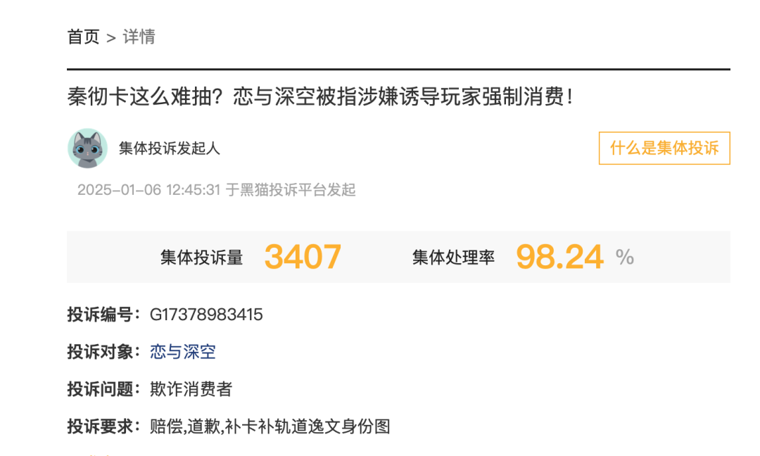 此外,还有大量投诉聚焦于叠纸旗下的游戏《恋与深空》。今年年初,有用户在黑猫投诉平台上发起集体投诉称,《恋与深空》涉嫌诱导玩家强制消费,此事一度冲上热搜。