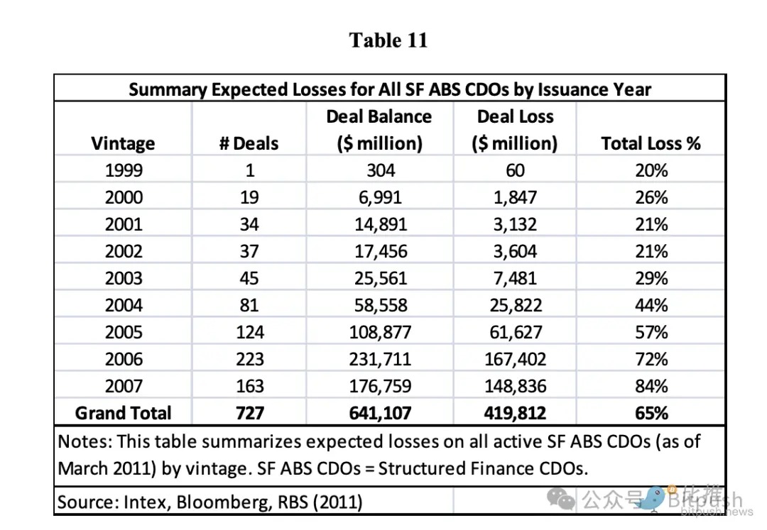 回顾 2000 年代中期,美国结构化金融产品(尤其是以次贷抵押贷款为底层的 CDO)在发行时获得大量高评级,许多甚至被贴上 AAA 标签。研究指出,约 2005-2007 年间,美国发行了 727 只“资产支持型 CDO(SF ABS CDO)”,总规模约 6,410 亿美元,而这些产品暴雷后累计减记约 4,200 亿美元。