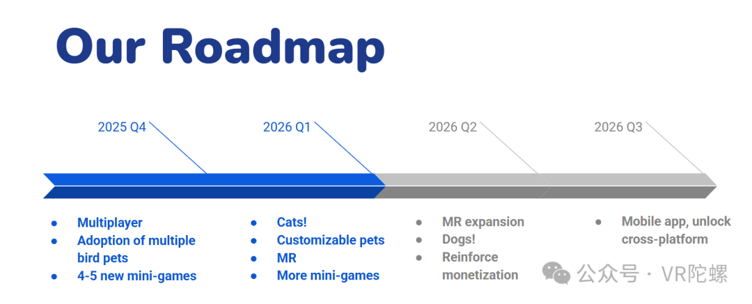 Wendelin Reich:后续更新计划如路线图所示。玩家们提出了很多要求,包括多人模式、猫咪、新迷你游戏以及更多玩具。需求明确且日益增长。有了适当的支持,我们能加速推进路线图,将《Forever Pets》拓展为终极XR宠物宇宙。