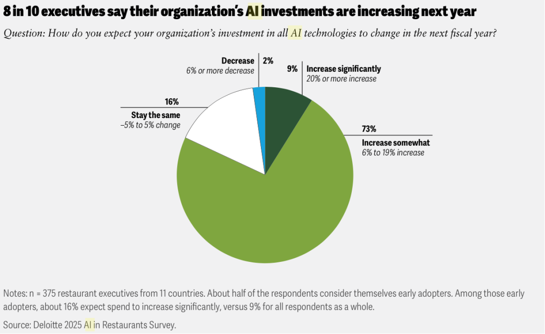 德勤发布的《2025 AI革新餐饮业全球餐饮业AI就绪度与应用状况调查报告》也印证了这一趋势:在接受调研的11个国家的375位餐厅执行人员中,73%的受访者表示他们可能会略有增加AI投资金额,另外9%预测将会有显著增加。