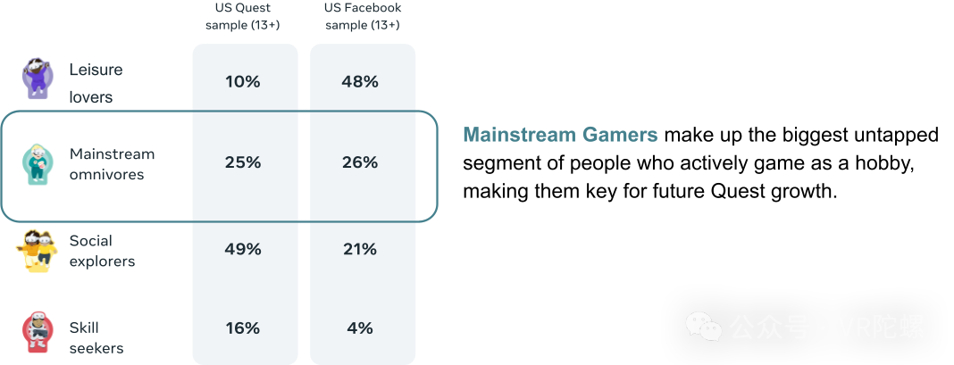 主流杂食者在Quest上具有很好的代表性,并且最有可能尝试各种不同的体验。这个群体代表了将新用户带入生态系统的最佳机会,因为他们享受将传统游戏作为爱好。为了吸引他们,我们正在投资于那些超越以精通为重点的体验(主要吸引技能追求者)的游戏,转而提供更全面、低风险的游玩体验。