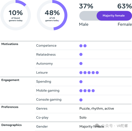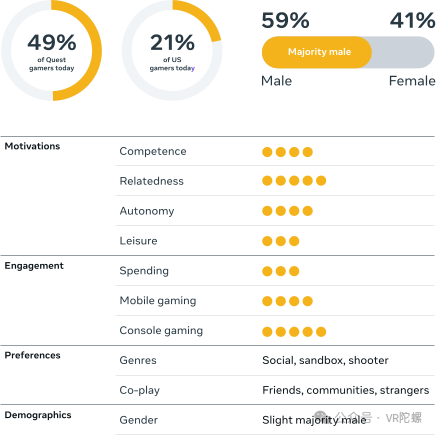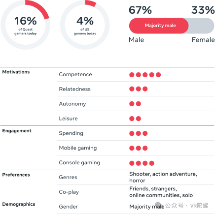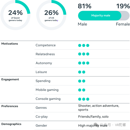 下面是Meta官方发布的用户报告,将剖析关键的受众行为和动机,这可以帮助开发者为VR游戏规划有效的内容和营销策略。