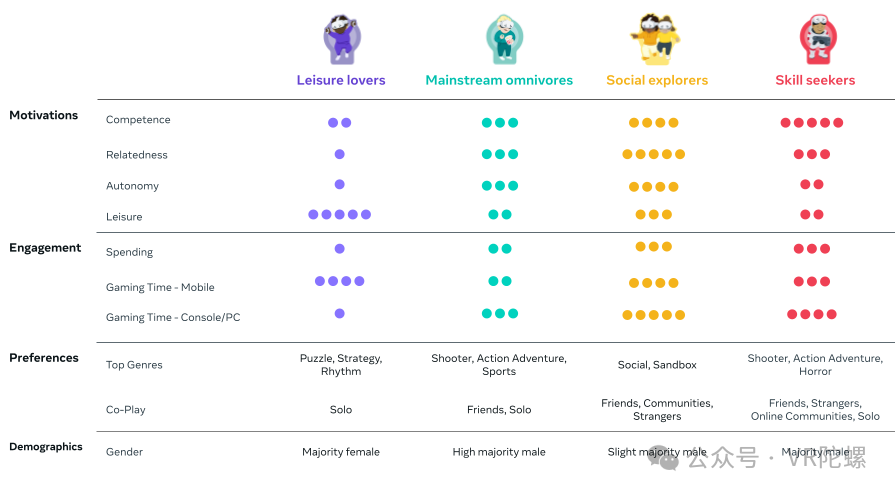 游戏是Meta Quest生态系统的核心。大多数购买Quest头显的人都是为了玩游戏,无论是专用的游戏程序、还是在Horizon Worlds中,甚至是串流玩PC游戏。但人们玩游戏的动机各不相同,这为开发者了解当前的Quest用户画像提供了洞察。例如: