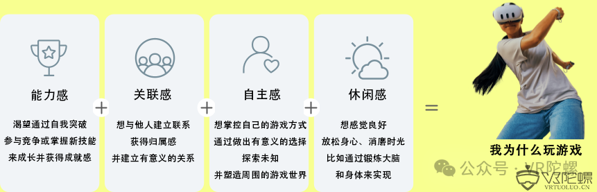 我们的细分超越了特定平台的习惯,专注于人们为什么玩游戏的根本原因,而不仅仅是在Quest上。这种方法用新的数据和对玩家动机更深入的洞察更新了我们2020年的游戏市场细分。借鉴自我决定理论,我们发现用户受到四个关键驱动因素的激励: