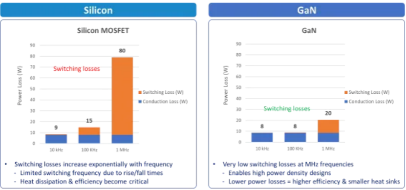 在800V到终端供电的全链路转换中,GaN器件实现了效率与密度的双重突破。当前800VDC架构的主流转化方案采用100V GaN器件的Buck方案,效率比硅方案提升1%以上,频率提高3倍,电感体积减少30%。