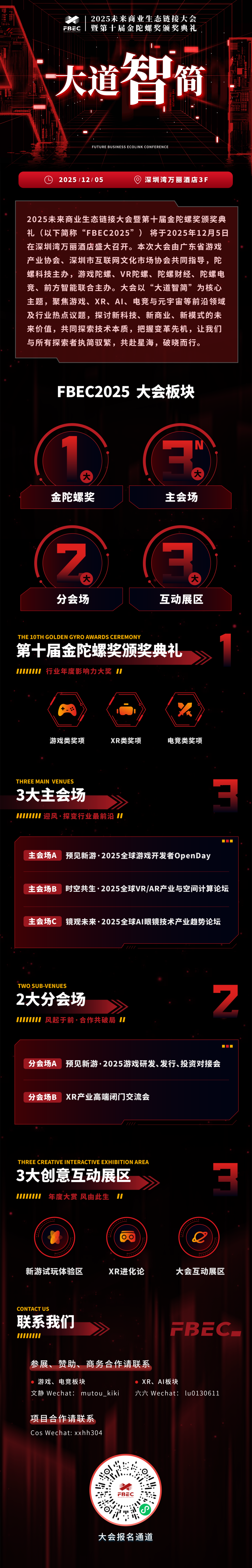 2025未来商业生态链接大会暨第十届金陀螺奖颁奖典礼(以下简称“FBEC2025”) 将于2025年12月5日在深圳湾万丽酒店盛大召开。本次大会由广东省游戏产业协会、深圳市互联网文化市场协会共同指导,陀螺科技主办,游戏陀螺、VR陀螺、陀螺财经、陀螺电竞、前方智能联合主办。大会以“大道智简”为核心主题,聚焦游戏、XR、AI、电竞等前沿领域及行业热点议题,探讨新科技、新商业、新模式的未来价值共同探索技术本质,把握变革先机,让我们与所有探索者执简驭繁,共赴星海,破晓而行!