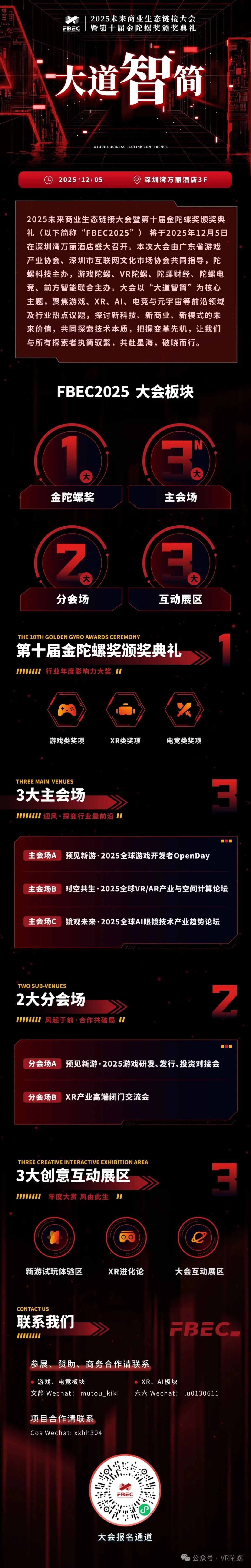 2025未来商业生态链接大会暨第十届金陀螺奖颁奖典礼(以下简称“FBEC2025”) 将于2025年12月5日在深圳湾万丽酒店盛大召开。本次大会由广东省游戏产业协会、深圳市互联网文化市场协会共同指导,陀螺科技主办,游戏陀螺、VR陀螺、陀螺财经、陀螺电竞、前方智能联合主办。大会以“大道智简”为核心主题,聚焦游戏、XR、AI、电竞等前沿领域及行业热点议题,探讨新科技、新商业、新模式的未来价值共同探索技术本质,把握变革先机,让我们与所有探索者执简驭繁,共赴星海,破晓而行!