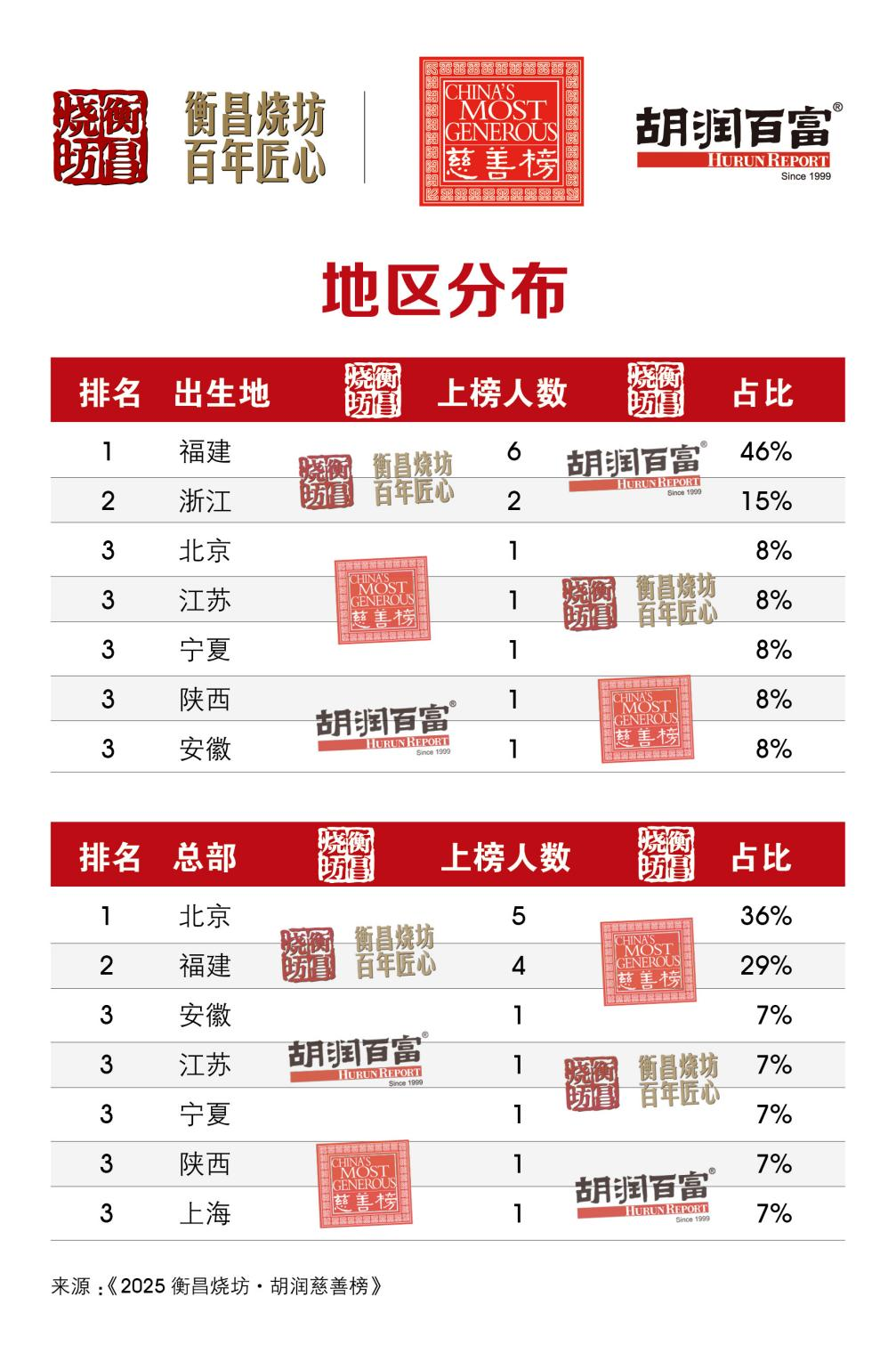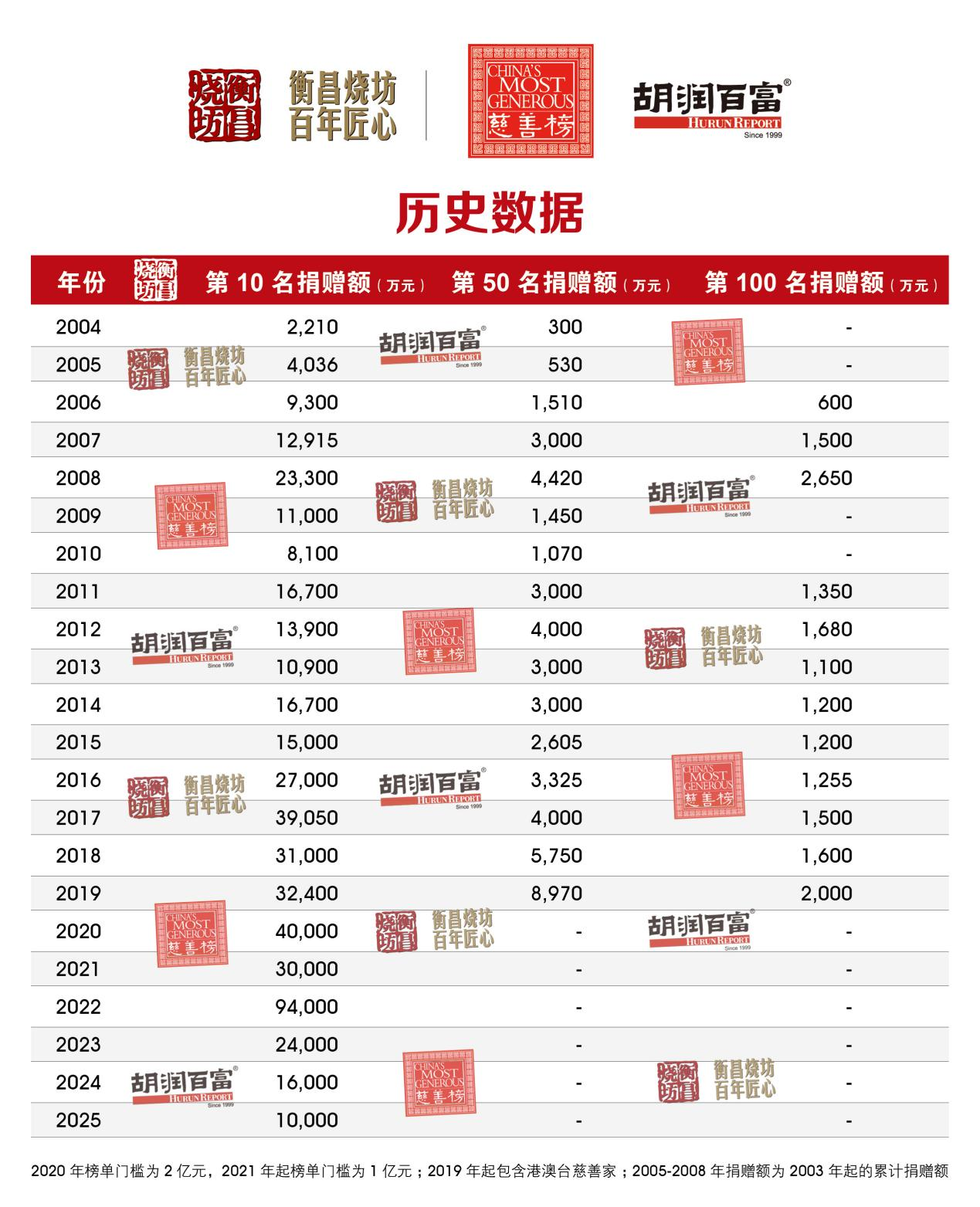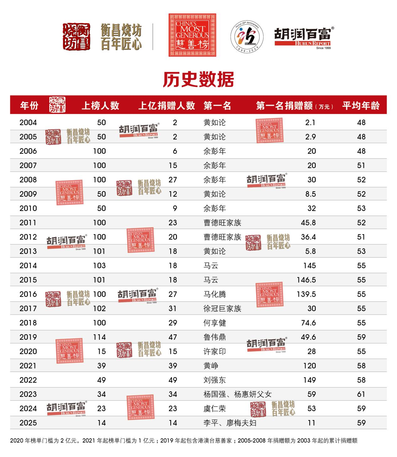 11月4日,胡润研究院发布《2025衡昌烧坊·胡润慈善榜》(HENGCHANG SHAOFANG · Hurun China Philanthropy List 2025)。统计区间为:2024年9月1日至2025年8月31日期间的现金和股权捐赠,以及有法律效力的承诺捐赠都统计在内。2025年8月31日至榜单发布日期间的1亿元以上大额捐赠,也计入本次统计。今年是胡润研究院连续第二十二次发布“胡润慈善榜”。