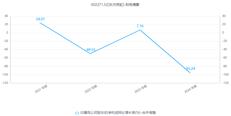 同花顺iFinD数据显示,2021年至2024年,东方雨虹分别实现营收319.34亿元、312.14亿元、328.23亿元、280.56亿元,同比增长率分别为49.96%、-2.26%、5.15%、-14.52%。