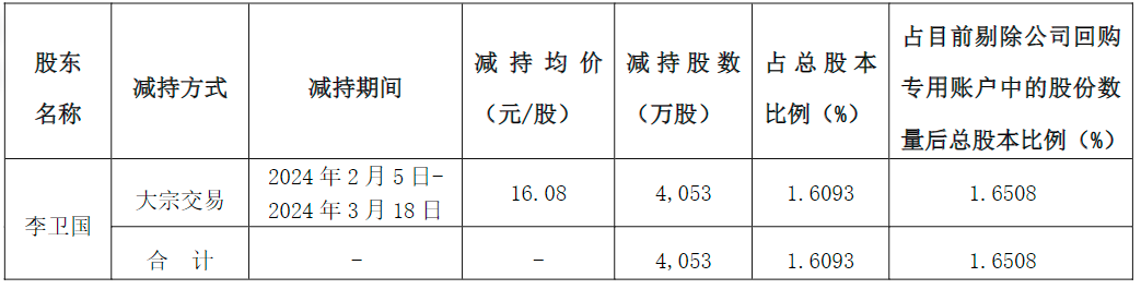 2024年2月5日至3月18日,为履行对员工持股计划的兜底承诺,李卫国通过大宗交易方式减持4053万股公司股份,减持均价为16.08元/股,套现6.52亿元。