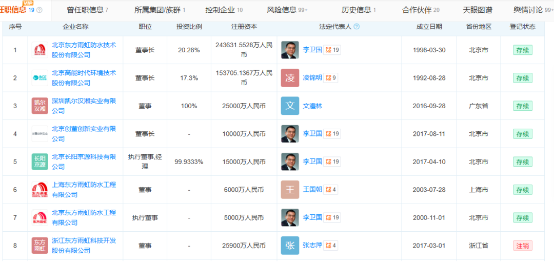 李卫国的资本版图不止于东方雨虹。天眼查显示,截至目前,李卫国在东方雨虹、北京高能时代环境技术股份有限公司、深圳凯尔汉湘实业有限公司等7家存续企业中担任高管。