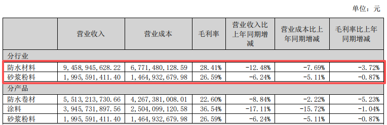 尽管三季报并未披露具体毛利率变化情况,但此前东方雨虹2025年半年度报告显示,作为公司主要收入来源的防水材料,上半年毛利率同比减少了3.72个百分点至28.41%,营收同比下降12.48%至94.59亿元。