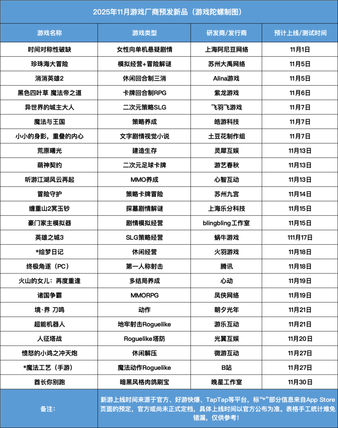 除了已定档的游戏,陀螺君也统计了11月正在测试或将开启限量测试的新游,共计16款。