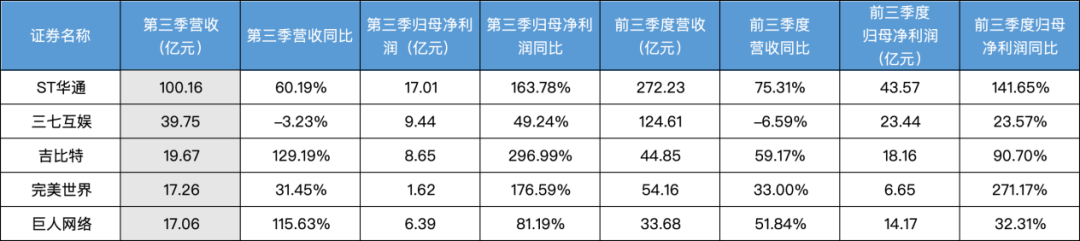 如完美世界,综合前三季度的营收及净利润,该公司的业绩要优于吉比特。财报显示,完美世界前三个季度营收为54.17亿元,同比增长33%,净利润6.66亿元,同比增长271.17%。