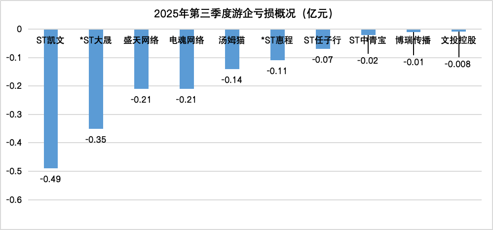 今年Q3,A股游戏板块有10家公司净利润为负值,数量较去年同期减少。其中,凯撒文化以亏损0.49亿元居首,*ST大晟(-0.35亿元)次之、盛天网络(-0.21亿元)、电魂网络(-0.21亿元)、汤姆猫(-0.14亿元)进入“败家”TOP5行列。
