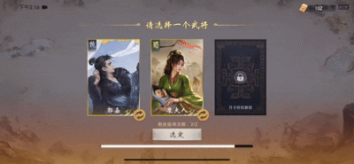 玩家进入关卡前,需要先选择武将,可随机换将两次,选将框只有两个,相当于单局内最多有四个武将可供选择。