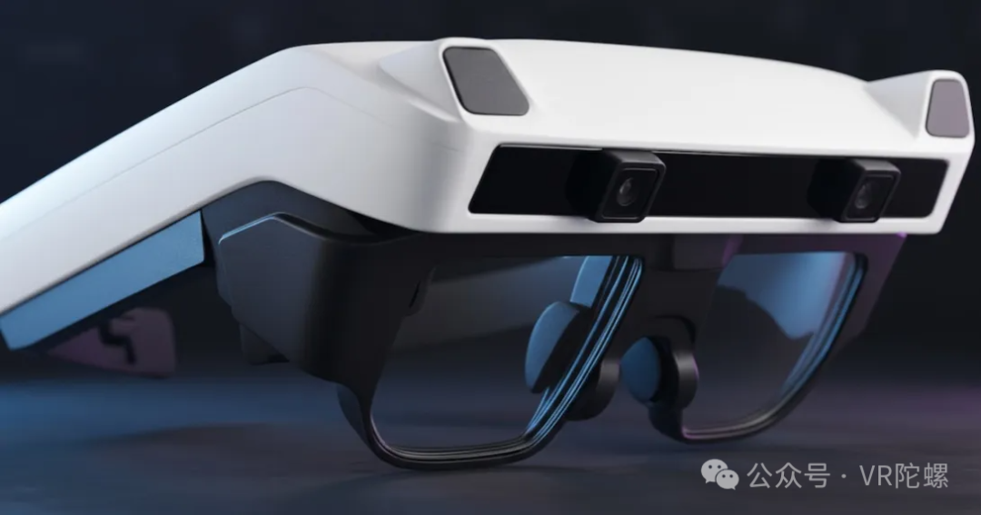 该头显设有透视模式切换键与音量调节键。虽未实际测试音质,但Xrostella VR1内置扬声器和麦克风。头显顶部两侧各设两枚追踪摄像头,中央搭载一枚透视摄像头。