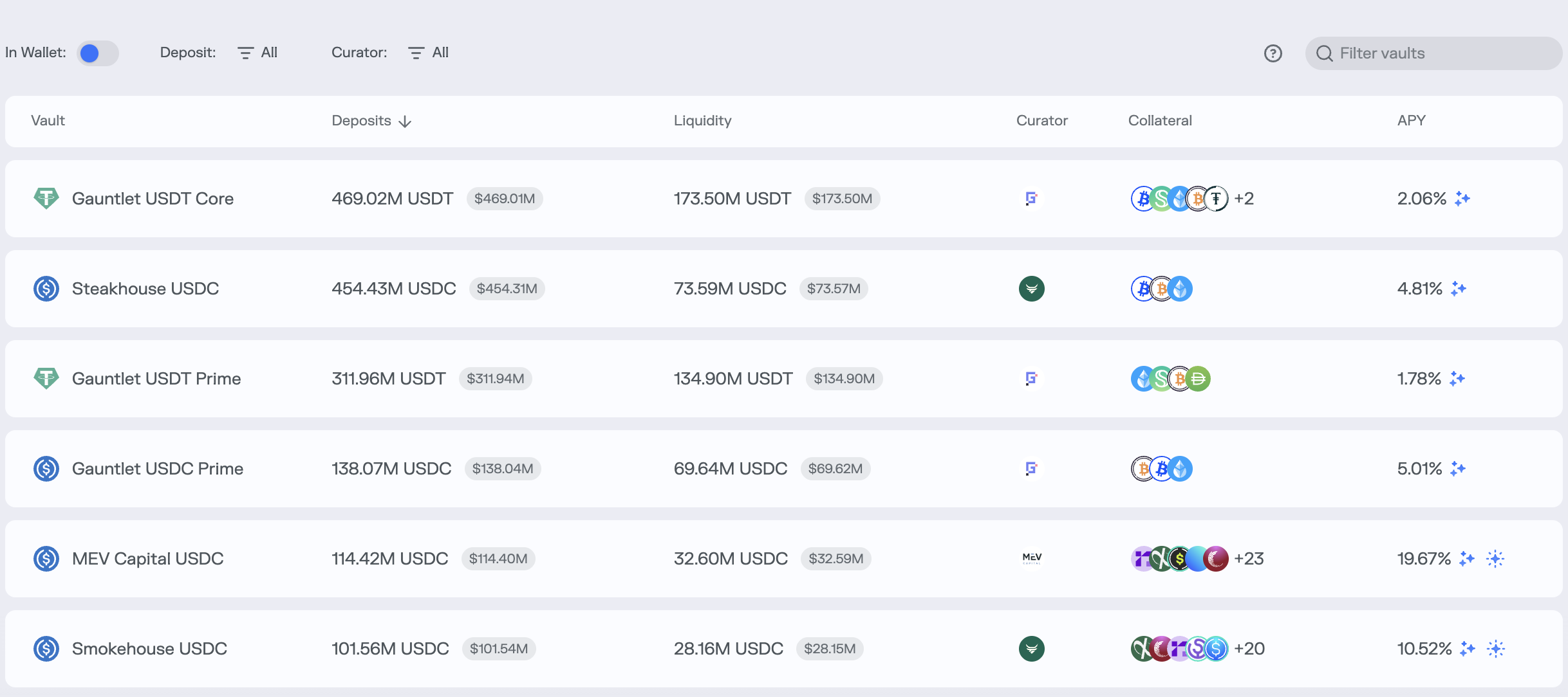 于是,它们引入了 Curator 模式。用户不再将钱存入一个统一的池子,而是选择由 Curator 管理的一个个「金库」(Vaults)。用户将钱打进金库,Curator 则全权负责如何用这些钱去投资、去生息。