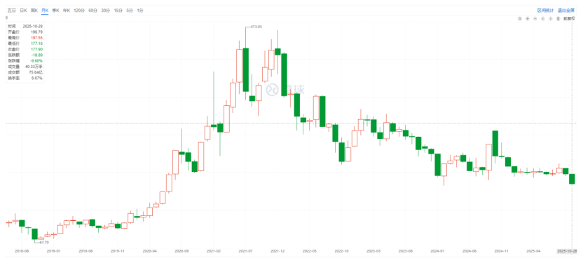 随着经营业绩的全面溃败,片仔癀在二级市场上也遭到了投资者的“用脚投票”。10月20日,也就是三季报财报公布之后的第一个交易日,片仔癀股价大跌4.71%至187.09元/股,单日市值缩水超55亿元。截至目前,片仔癀股价已经跌至176元/股,最新市值仅为1061亿元,距离2021年时的高点跌超六成。