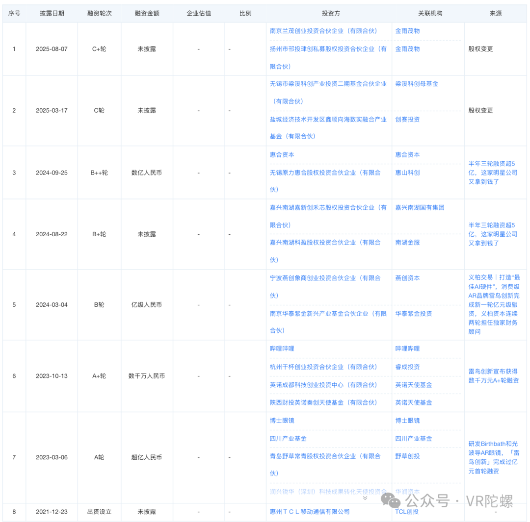 2025 年 11 月 7 日,雷鸟创新宣布完成由中信金石领投、中信证券国际资本及中信证券投资共同参与的 C 轮融资,据称本轮融资创下 2025 年国内 AI+AR 眼镜领域单笔融资金额的最高纪录。