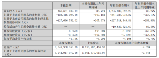 整个前三季度,公司累计实现营业收入12.96亿元,较去年同期减少32.27%;归母净利润为-2.41亿元,同比减少256.10%。