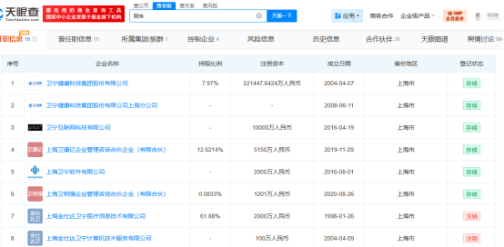 天眼查显示,截至目前,周炜担任卫宁健康、卫宁互联网科技有限公司、上海卫宁软件有限公司等6家公司法定代表人,涉及企业管理咨询、互联网,商务信息等行业。
