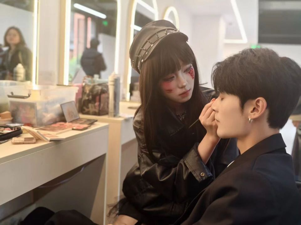 中瑞产业园长鲸传媒排练室内,模特出身的林不染,和几位身着统一西服的伙伴,正配合着节奏感十足的音乐,反复打磨一个动作,任由细密汗珠浸透全身。