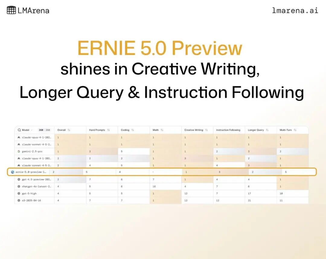 因此,文心大模型5.0-Preview的成绩,是其核心语言能力、创造力与用户体验获得全球范围认可的证明。