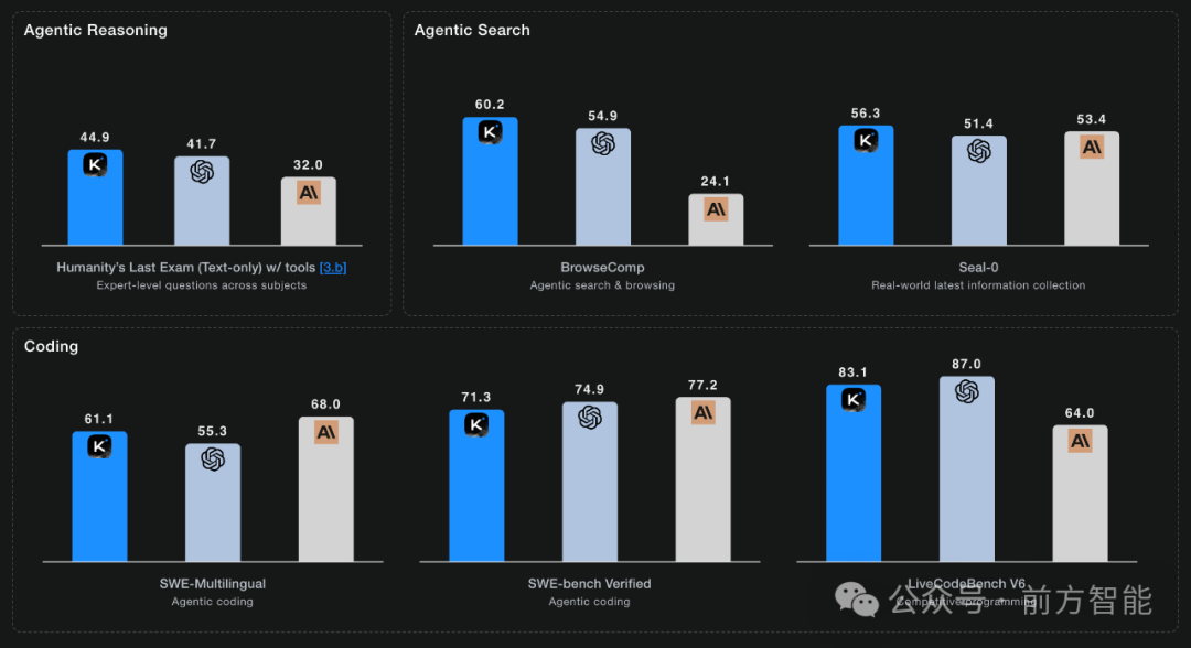 官方评测显示,K2 Thinking 在 Humanity’s Last Exam(HLE,文本版带工具)得分 44.9%,BrowseComp 60.2%、SWE‑Bench Verified 71.3%、LiveCodeBench v6 83.1%、Seal‑0 56.3%,在多项推理、搜索与编码基准上领先或逼近闭源前沿模型,其中在 BrowseComp、GPQA 等任务中超过 GPT‑5 与 Claude Sonnet 4.5 的对应成绩。