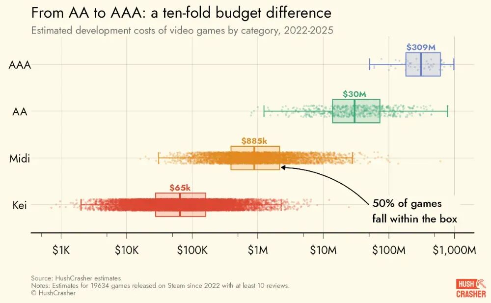 游戏开发成本呈现出鲜明的层级化特征。研究把游戏分成四档:小型游戏(Kei)、中型游戏(Midi)、AA级游戏、AAA级游戏。