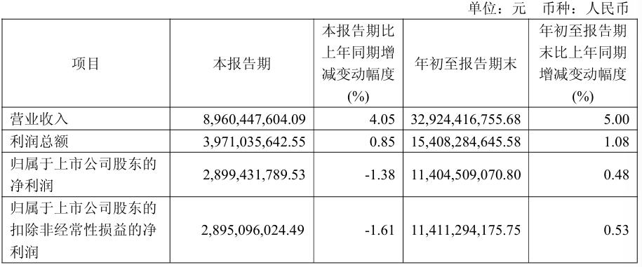 其中,第三季度,山西汾酒实现营业收入89.6亿元,同比增长4.05%;归母净利润为28.99亿元,同比下降1.38%;扣非归母净利润28.95亿元,同比下降1.61%。