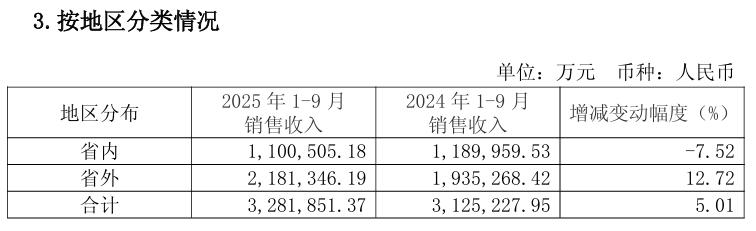 今年前三季度,山西汾酒销售区域和销售渠道都出现了标志性改变。销售区域方面,省外销售收入为218.13亿元,同比增长12.72%,占总营收比重提升至66.25%,而省内市场收入为110.05亿元,同比下降7.52%。省外市场的快速增长与省内市场的收缩,反映出山西汾酒正在经历一场区域结构的深度调整。其中,第三季度省外市场收入同比大幅增长31.14%,销售占比高达74.59%。