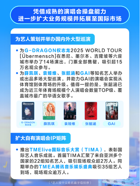 腾讯音乐也凭借专业、成熟的演唱会操盘能力,进一步扩大业务规模,不仅为G-DRAGON权志龙2025 WORLD TOUR [Übermensch]举办在悉尼、墨尔本、吉隆坡等六座城市的14场演出,还为薛凯琪、袁娅维、张韶涵和GAI等知名艺人举办或出品多场大型巡演;其自有演唱会IP矩阵也不断扩展,推出首届TMElive国际音乐大赏(TIMA),汇聚来自亚洲多个国家的22组知名艺人,为现场超2万名乐迷呈现了具有感染力的多元音乐盛宴,同期举办的2025年腾讯音乐娱乐盛典(TMEA)同样引发线上线下观众热烈互动。腾讯音乐聚力技术创新,本季度创新视觉设计与功能玩法,并进一步完善差异化会员体系,为不同需求的用户带来更丰富的服务选择,有效增强用户满意度与参与度,驱动用户活跃度及转化率进一步提升。更优质的听歌体验和更丰富的艺人相关权益推动超级会员规模持续扩大。