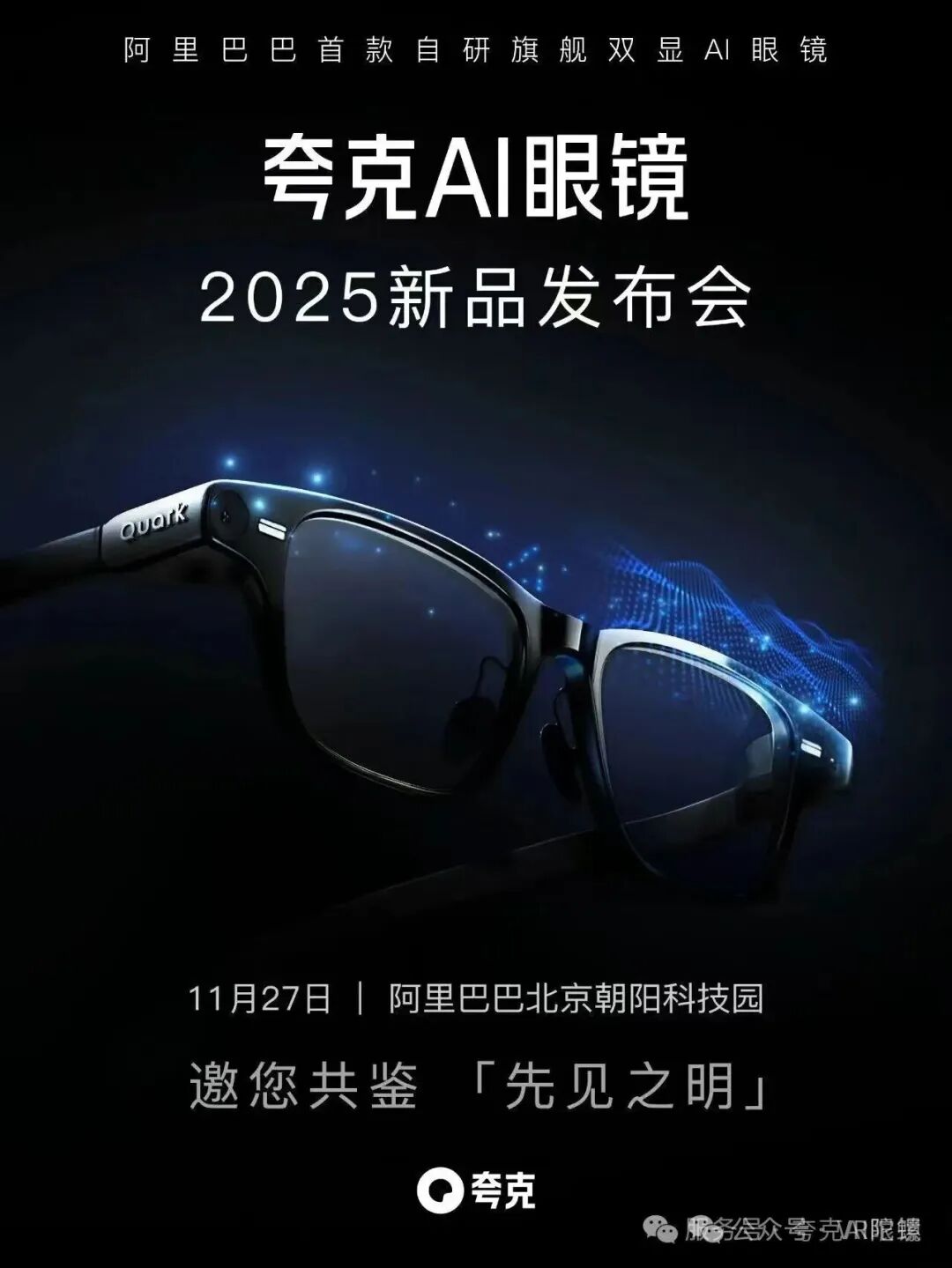 阿里自研夸克AI眼镜2025新品发布会定档11月27日
