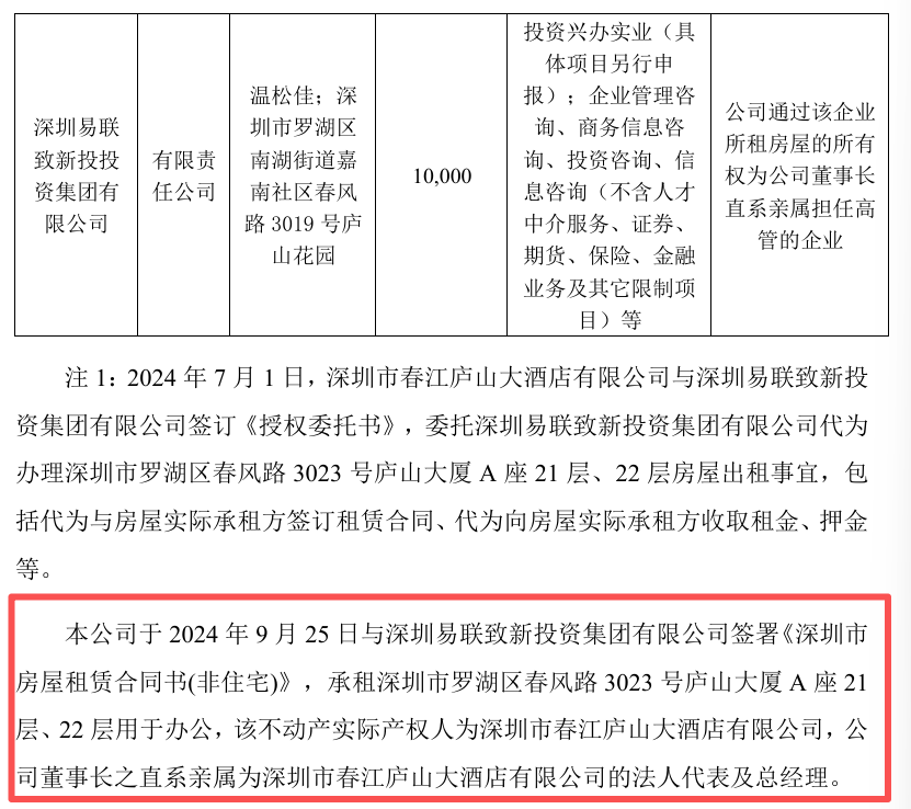 不过,林晓晴的背景之谜,在一则关联交易公告中得到部分解答。2025年4月9日,成都路桥发布关于预计2025年度日常关联交易的公告,预计在2025年度与关联方攀枝花川投宏格实业有限公司、深圳易联致新投资集团有限公司发生共计不超过5500万元的关联交易。其中,与深圳易联致新投资集团有限公司的500万元交易为承租罗湖区庐山大厦21-22层作为办公用房。