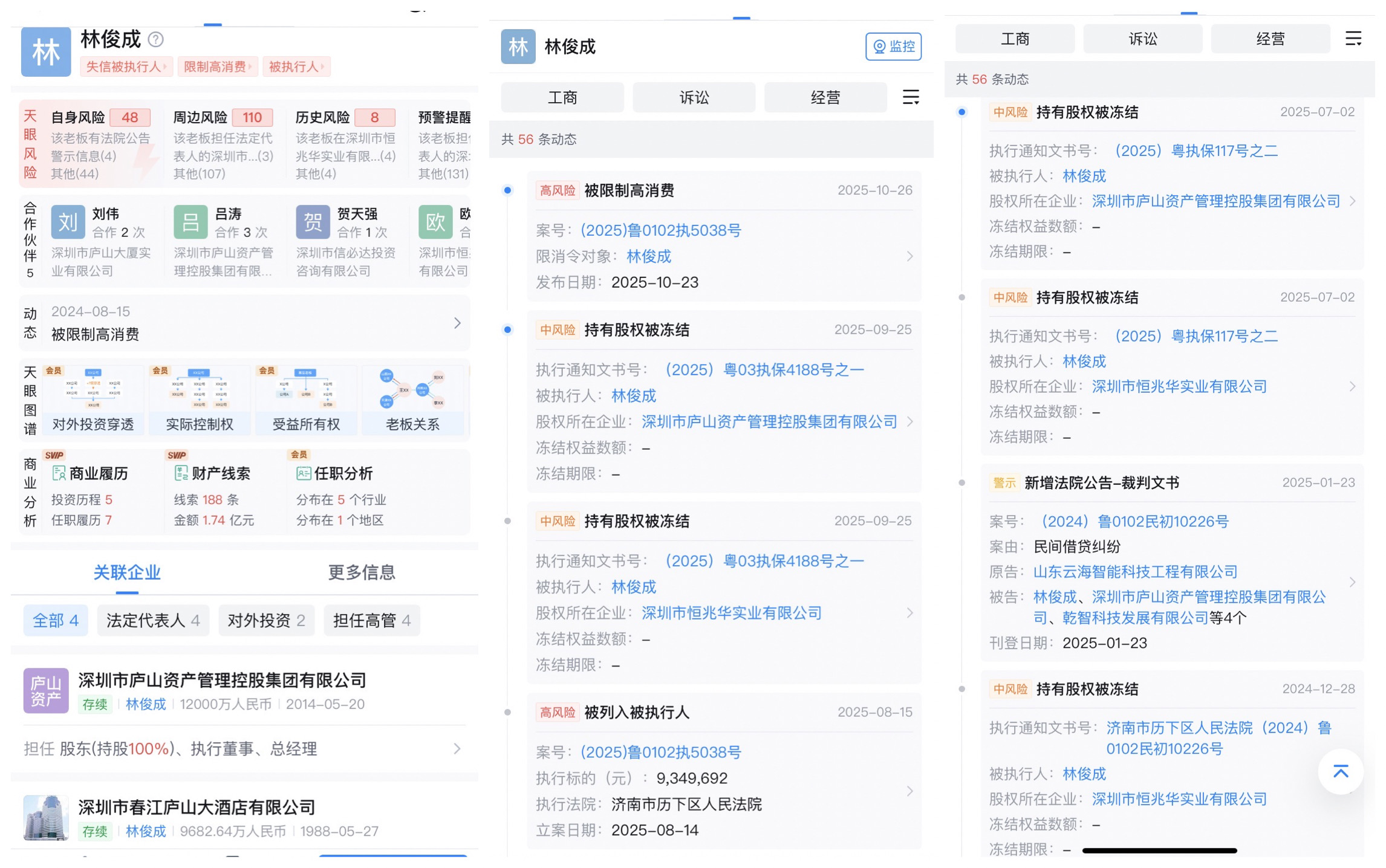 然而,光鲜的履历背后,林俊成的经营状况并不乐观。天眼查信息显示,林俊成涉及多起司法案件,案由多为民间借贷纠纷,目前为被执行人。10月23日,济南市历下区人民法院还对其发布了限制消费令,案由是拖欠山东云海智能科技工程有限公司超900万元的债务执行案件。