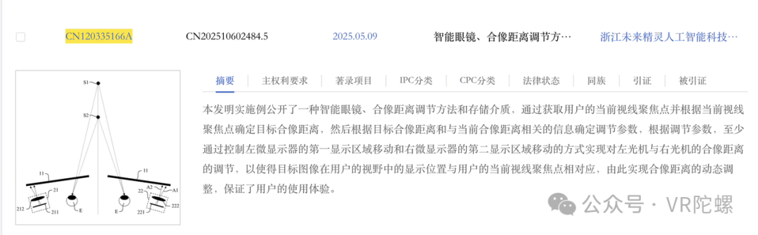 对此,夸克 AI 眼镜公布的专利显示,其提供的技术方案,有效解决了上述问题,具体技术专利摘要如下图所示,核心技术逻辑即“通过移动左右两块屏的显示区域,来调节左右光机的合像距离”。