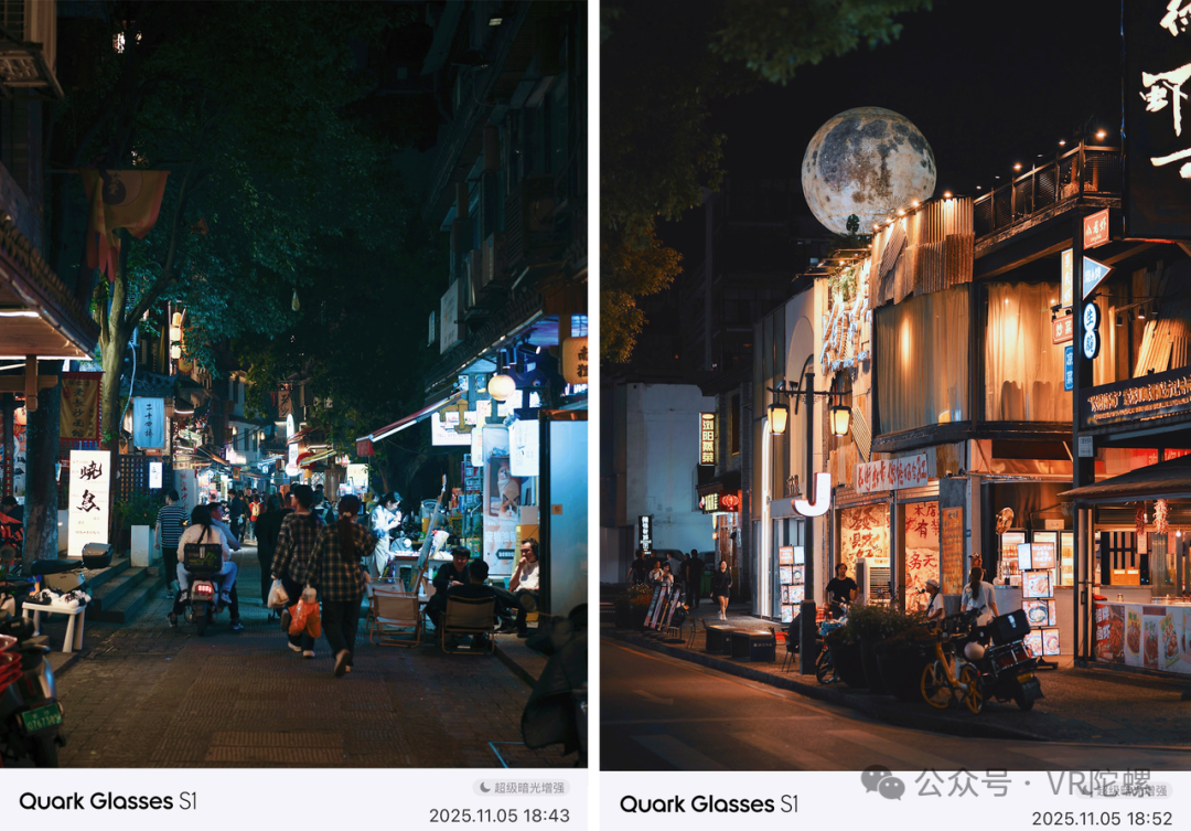 从目前官方所展示的拍摄样片来看,夸克 AI 眼镜可谓将夜景拍摄效果打磨到了极致,甚至接近部分旗舰手机的影像效果,可以称为这款 AI 眼镜最大的“杀手级”应用场景。过去,未经软硬系统性算法优化的 AI 眼镜,其夜景拍摄能力往往表现不佳,仅能达到五年前手机的水平,消费级产品一定不是单纯的「供应链堆砌」。