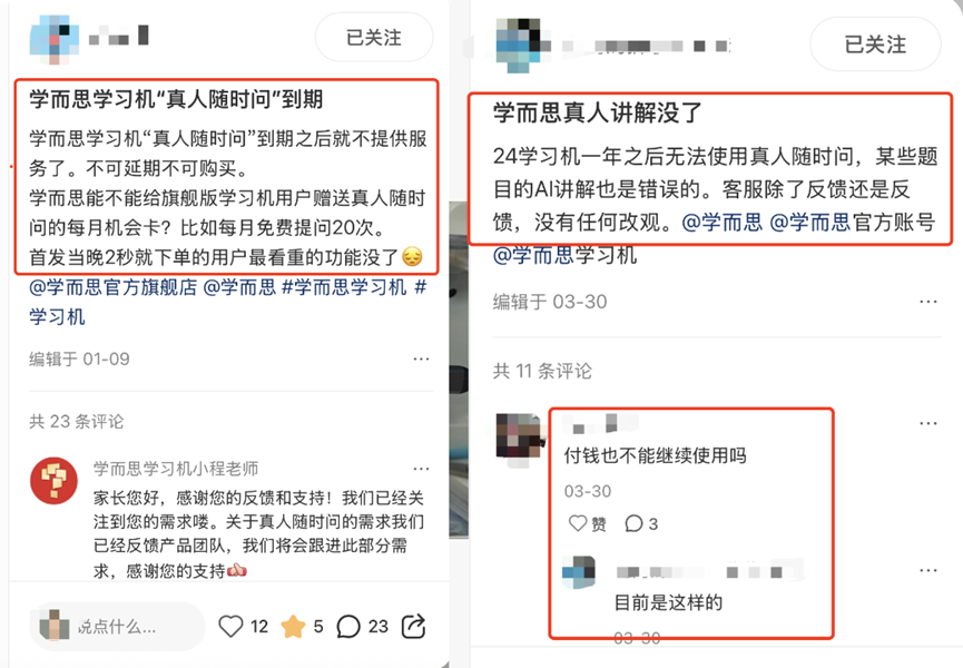 2025年6月,《凤凰网科技》报道称,有消费者表示,斥资超8000元购买学而思学习机时,学而思承诺提供“真人随时问”功能,然而一年后,该功能突然下线,并且无法续费。